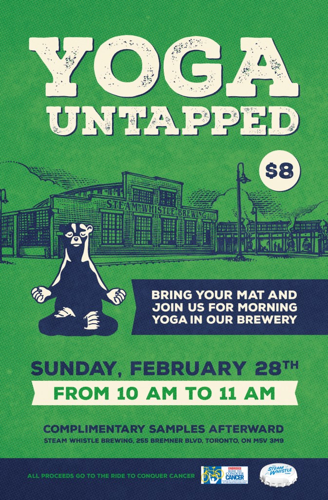 Title: YOGA UNTAPPED at Steam Whistle Brewing Location: Steam Whistle Brewing, 255 Bremner Blvd. Toronto, ON Date: Sunday, February 28th, 2016 Time: 10am-11am Cost: 8.00$ (goes directly to support the Ride to Conquer Cancer) Link: http://steamwhistle.ca/events/eventdetail.php?id=1872 Description: It’s back! On Sunday, February 28th bring your mat and get bendy at Steam Whistle Brewing for YOGA…