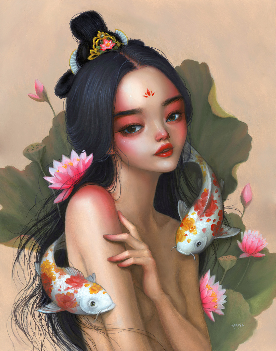 Happy D is a painter & illustrator specializing in portraits of ethereal maidens in surreal worlds. Her beautiful, yet lonely characters, are able to find a sense of belonging in an otherwise strange and eerie universe. This is a universe without the rules of logic or physics, where any idea or desire can manifest itself into poetic visuals. D’s art is meant to transplant the viewer into that same mind space of wonder and possibility. Her work has been sold in galleries and private collections around the world. Clients and partners include: Gamblin Artist Colors, Royal and Langnickel Brush, and Pinterest. She currently creates from Seattle, WA, in a studio shared with four furry assistants.