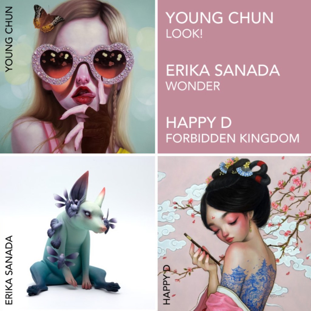 Opening night for the three-artist show with Erika Sanada, Happy D, and Young Chun is Saturday, May 18 from 7pm-11pm in Gallery 2, alongside Part 2 of CHG’s 13th Anniversary group show, entitled Pop Surrealism & New Figurative, in the Main Gallery and Where Do We Go From Here? group show in Gallery 3. Corey Helford Gallery is located at 571 S. Anderson St. Los Angeles, CA 90033 and normal hours are Tuesday – Saturday, from 12pm – 6pm.
