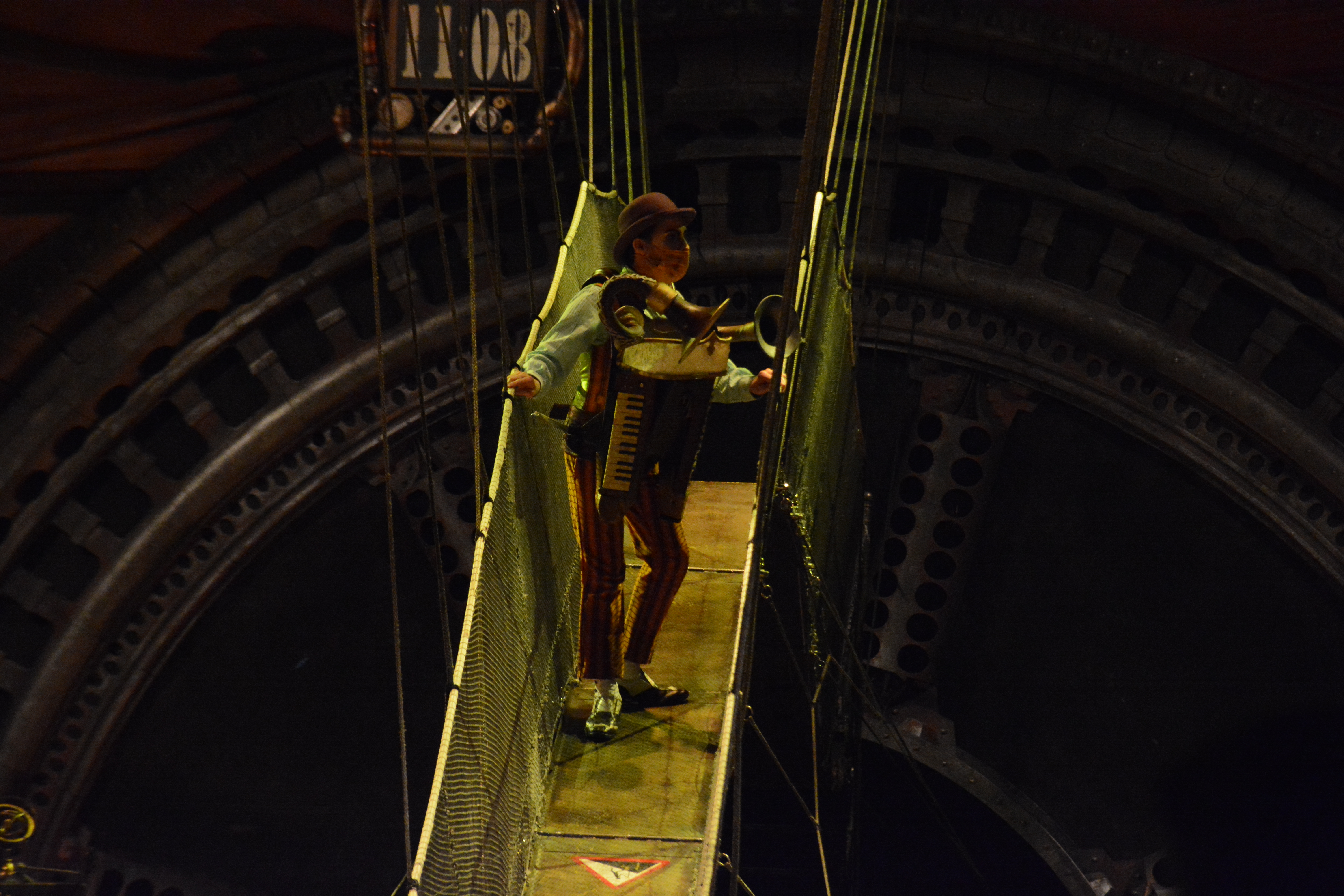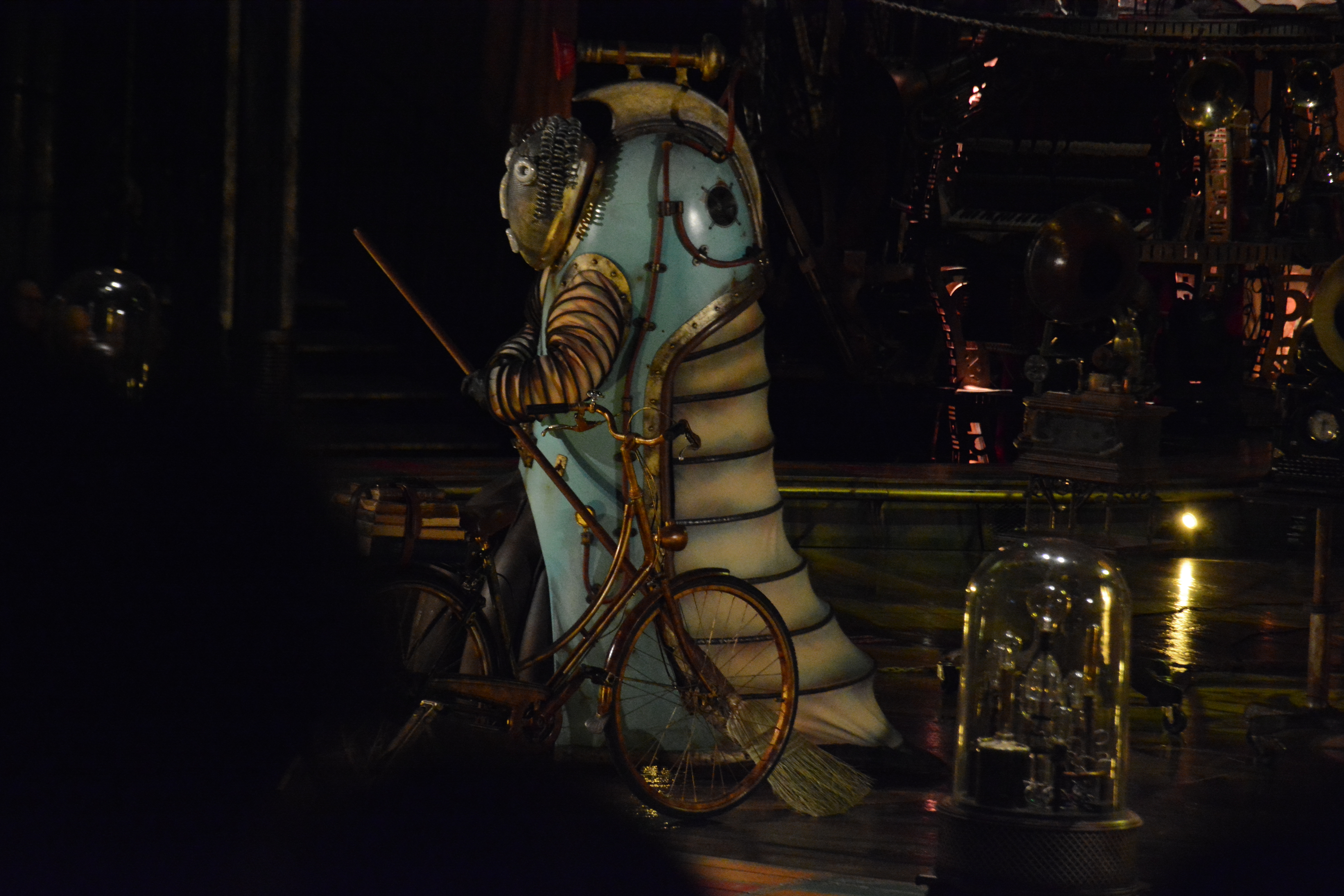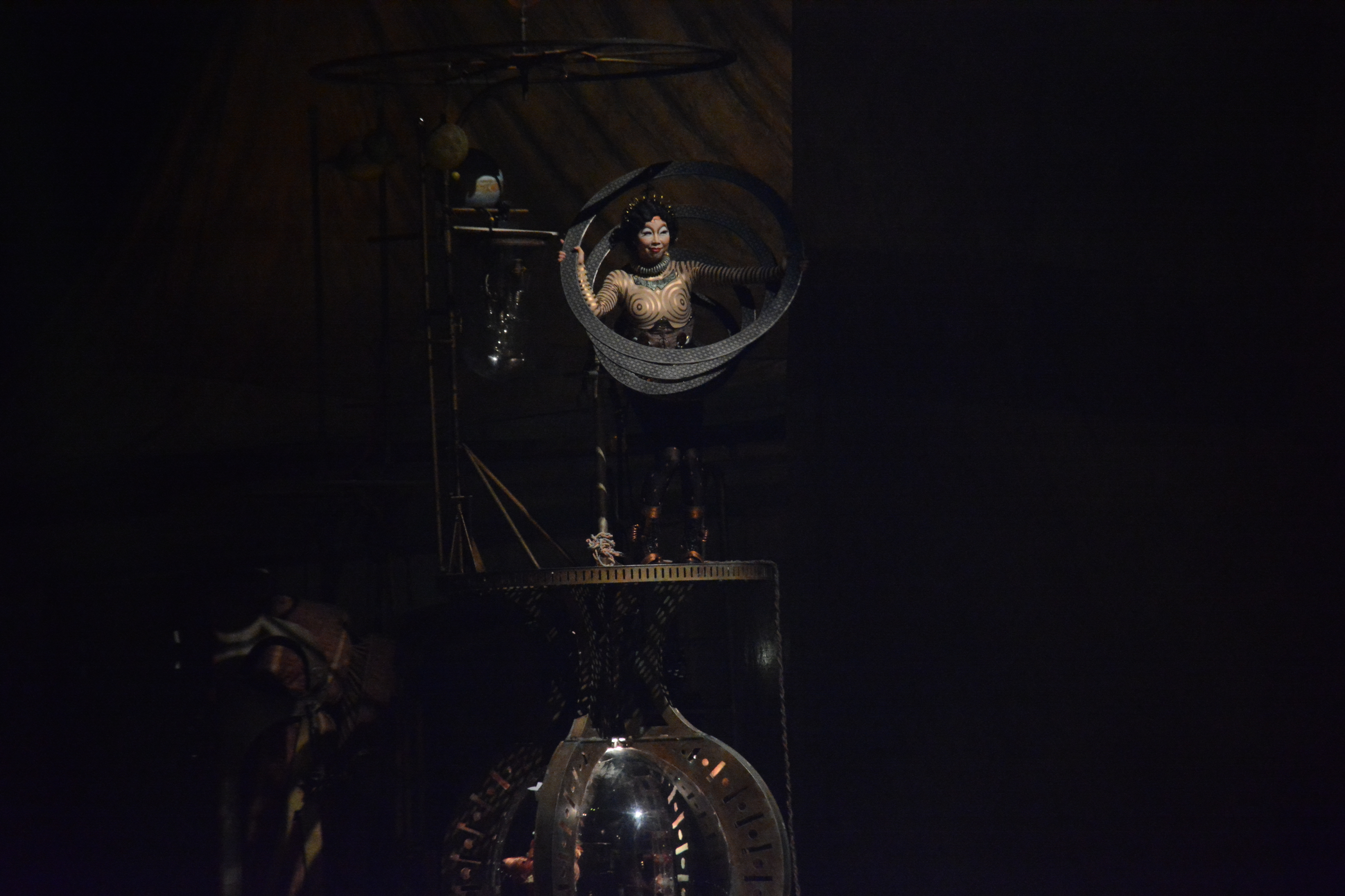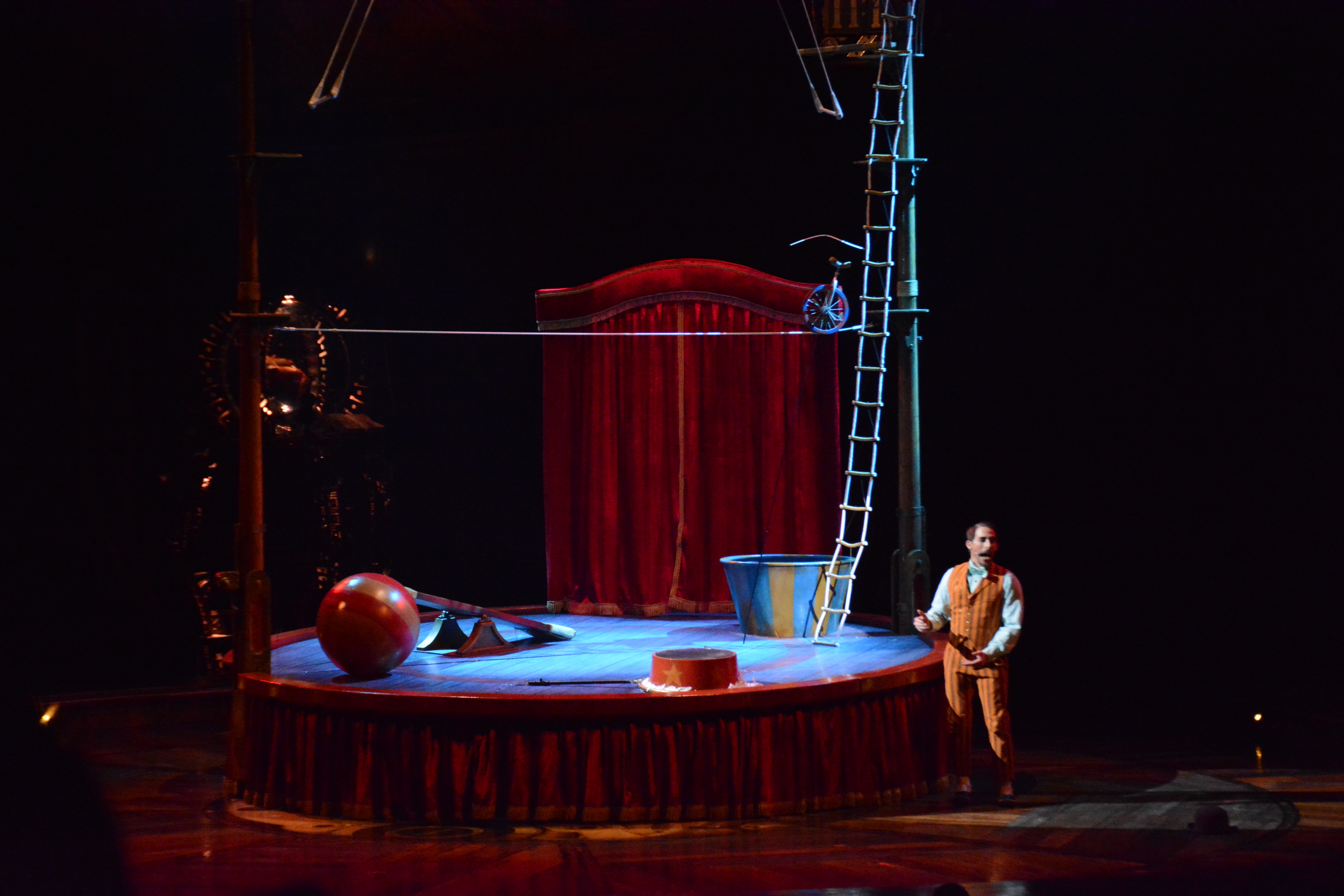 Since most of the performances are done on independent structures, it gave tthe audience more focus on the acts performing on the structures. The wooden floors of Kurios’ stage and the panels of wood were made from silicone from molds made from century old planks. Many of the stage and structures were made from recycled parts from various junkyards and fused together with various pipes and tubes.