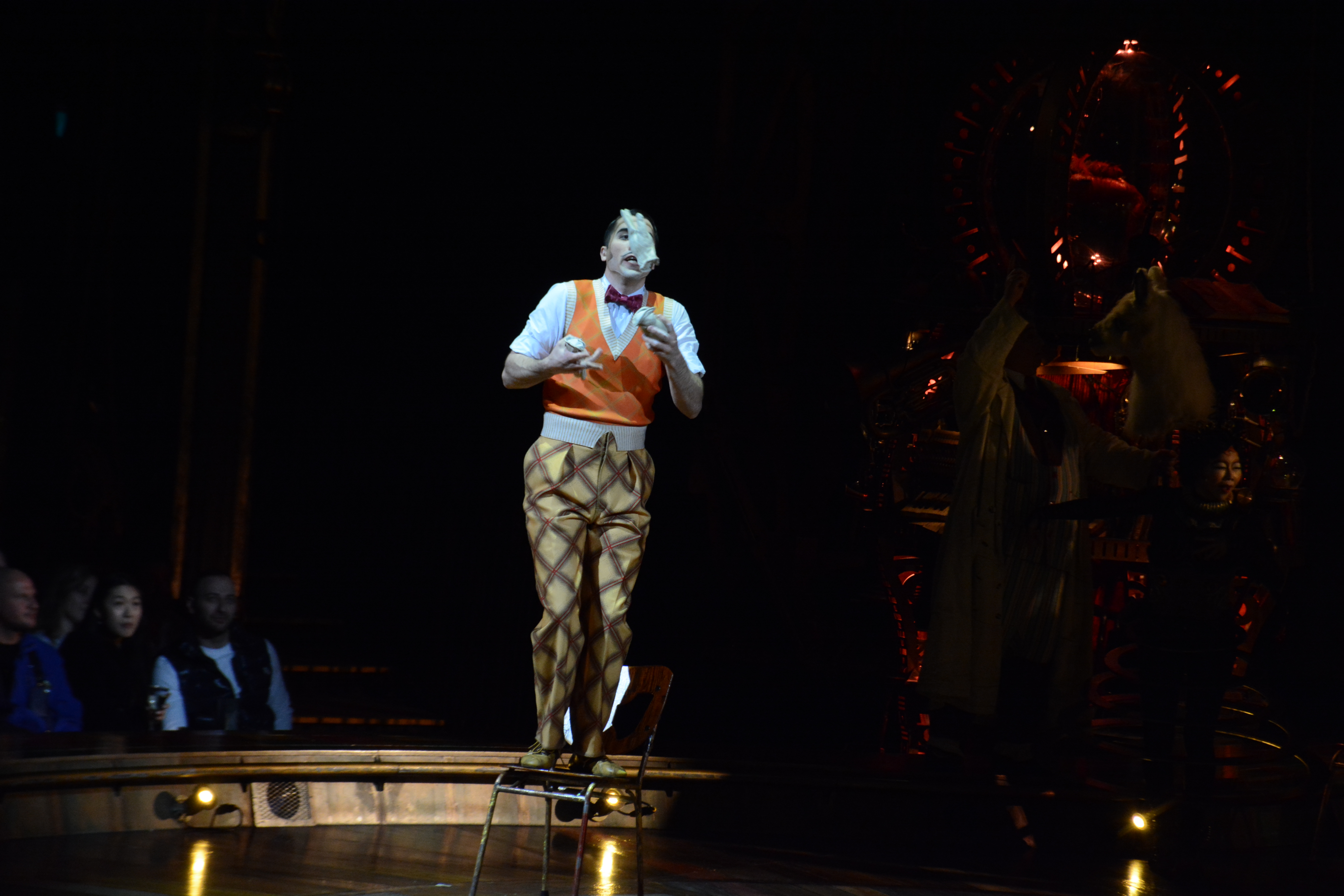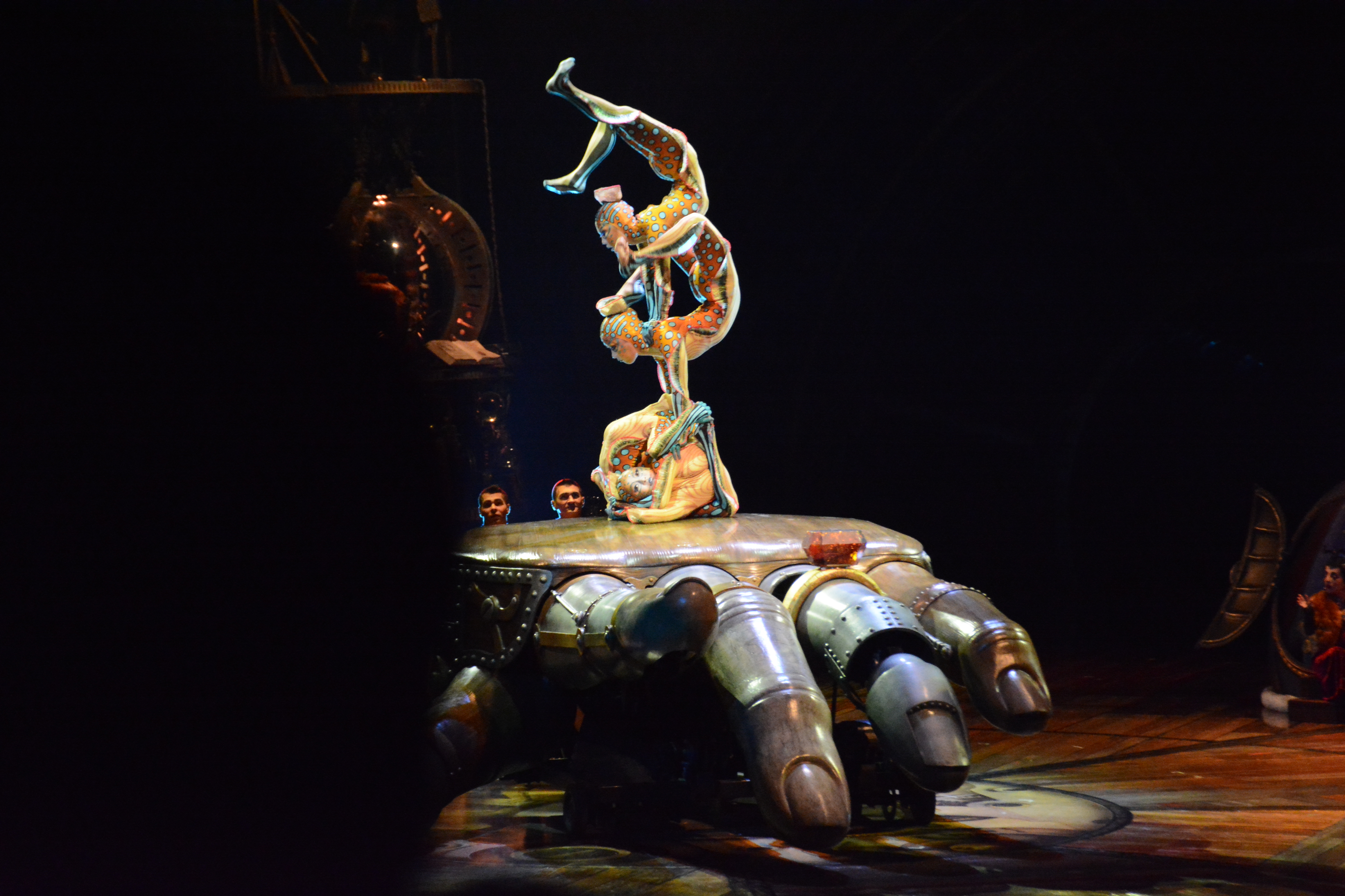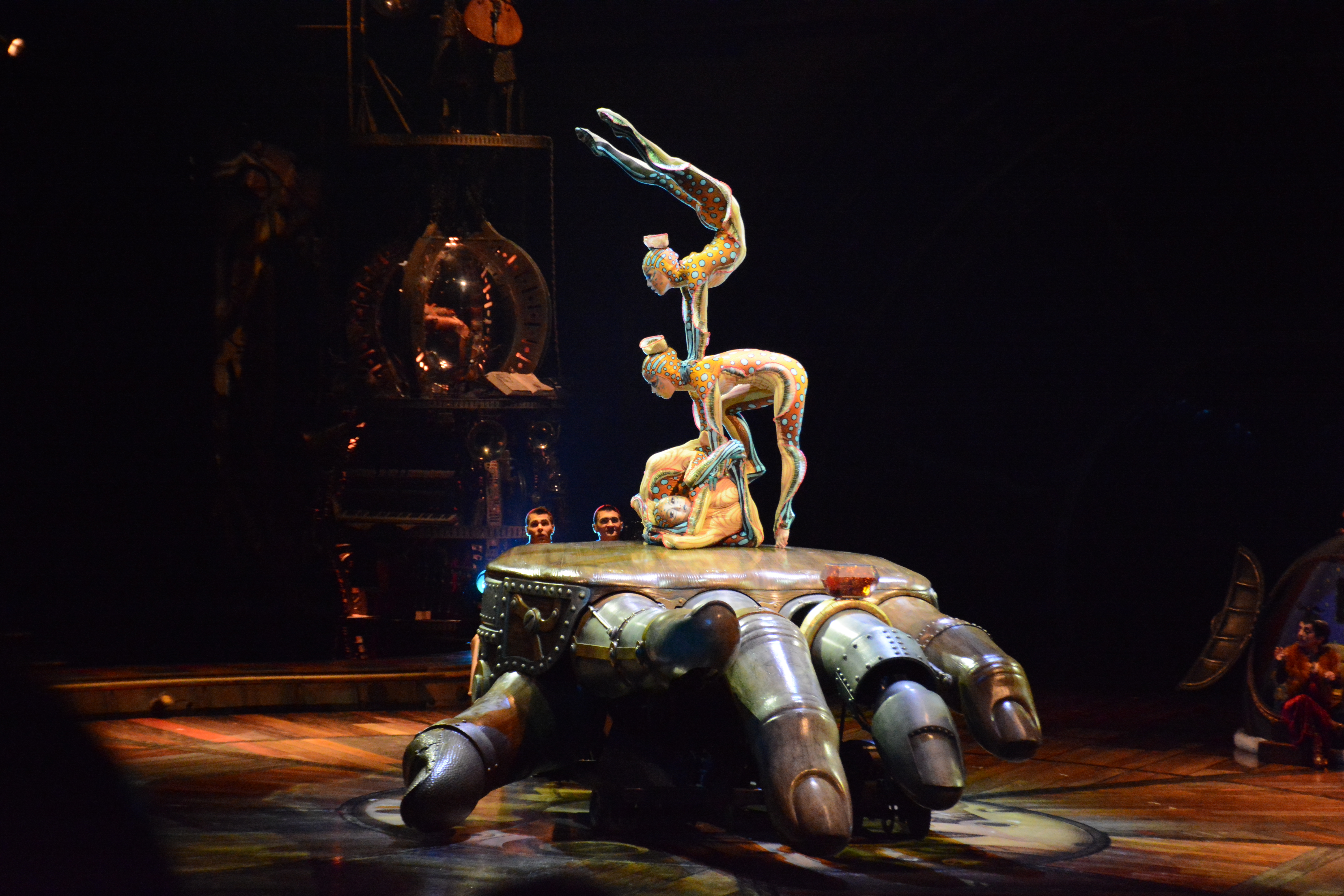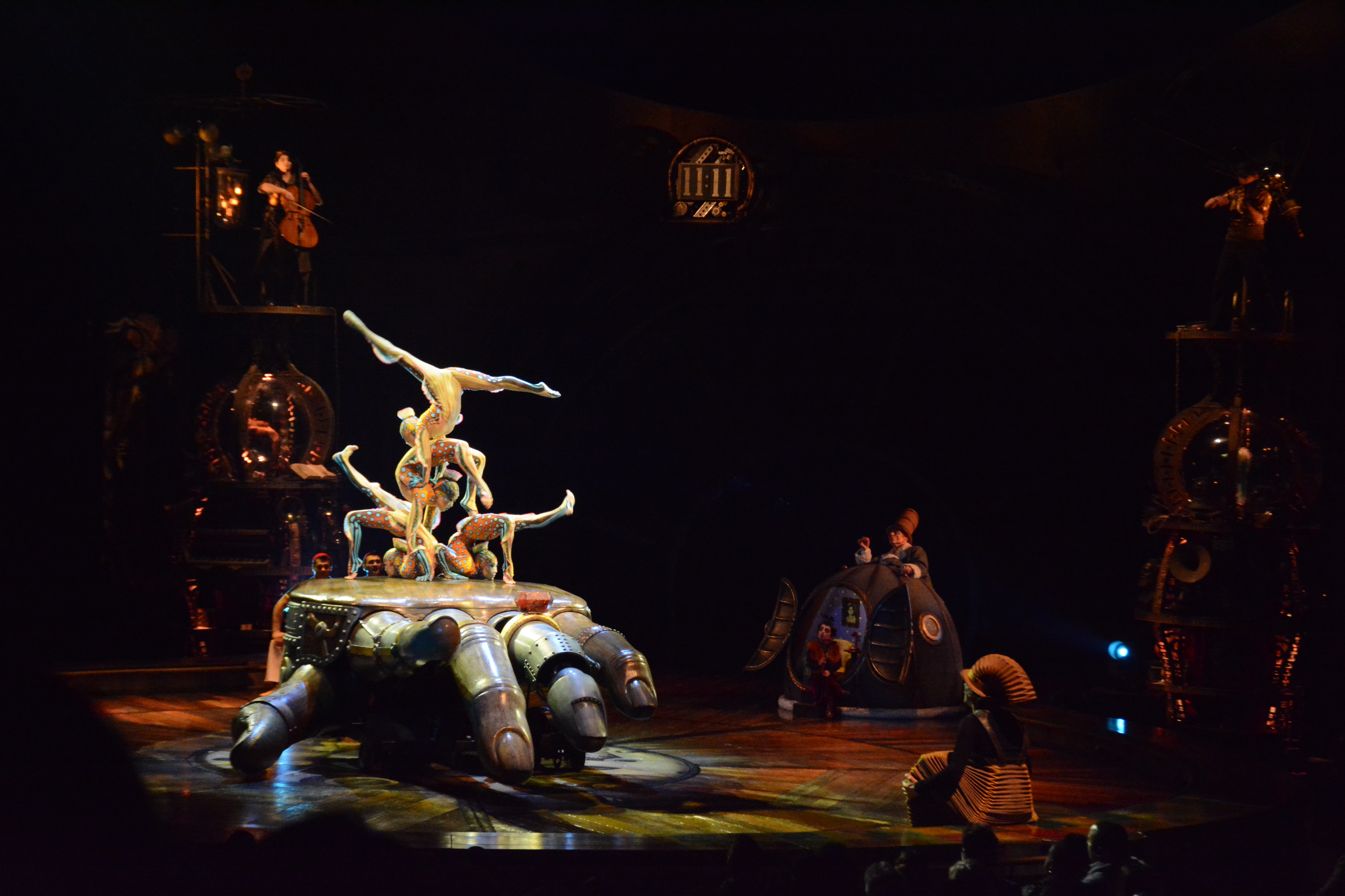 Since most of the performances are done on independent structures, it gave tthe audience more focus on the acts performing on the structures. The wooden floors of Kurios’ stage and the panels of wood were made from silicone from molds made from century old planks. Many of the stage and structures were made from recycled parts from various junkyards and fused together with various pipes and tubes.