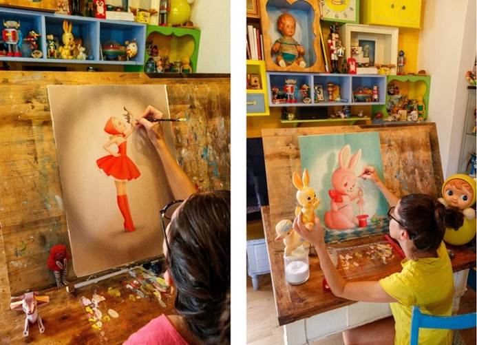 Ceccoli in her studio working on “What a Big Mouth (Little Bad Hiding Hood)” and “Pinky Wanna Have Fun”