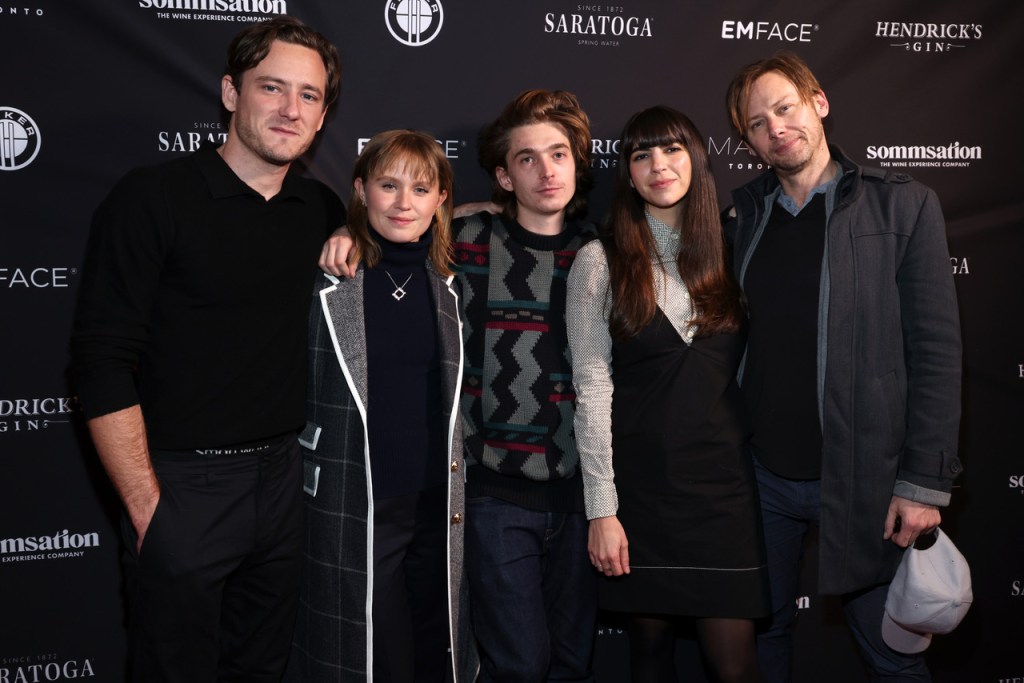 (l.-r.) Lewis Pullman, Eliza Scanlen, Austin Abrams, Laurel Parmet, and Jimmi Simpson at THE STARLING GIRL post-premiere party at Zooz Cinema Center, sponsored by Sommsation. Photo by Mark Von Holden.