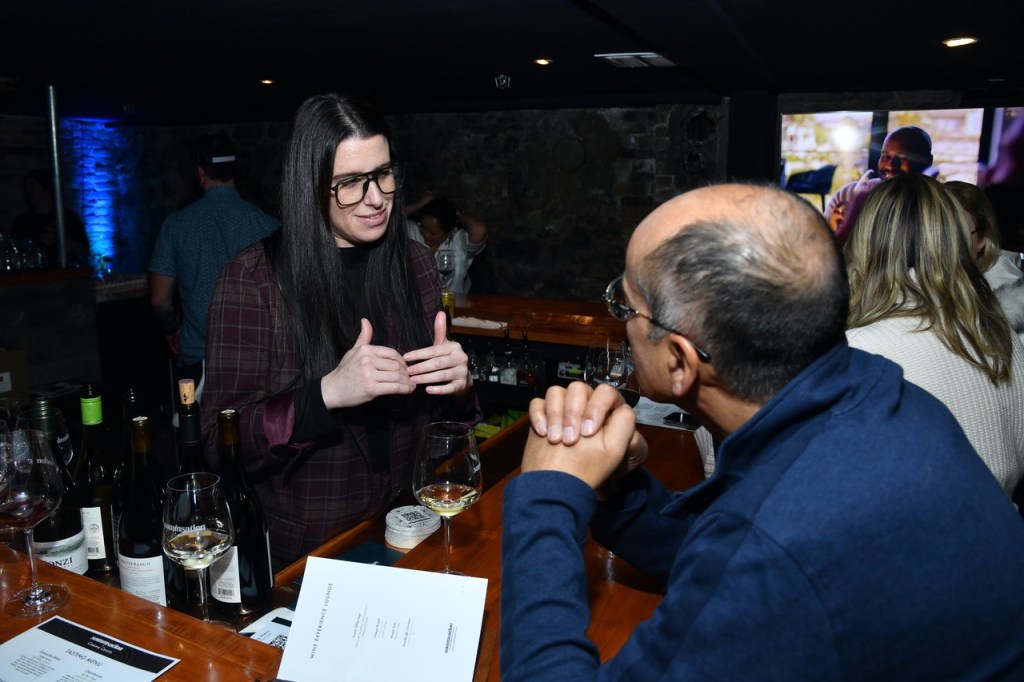Lead Sommelier Elyse Lovenworth with a film producer at Sommsation Lounge. Photo by Stephen Lovekin.
