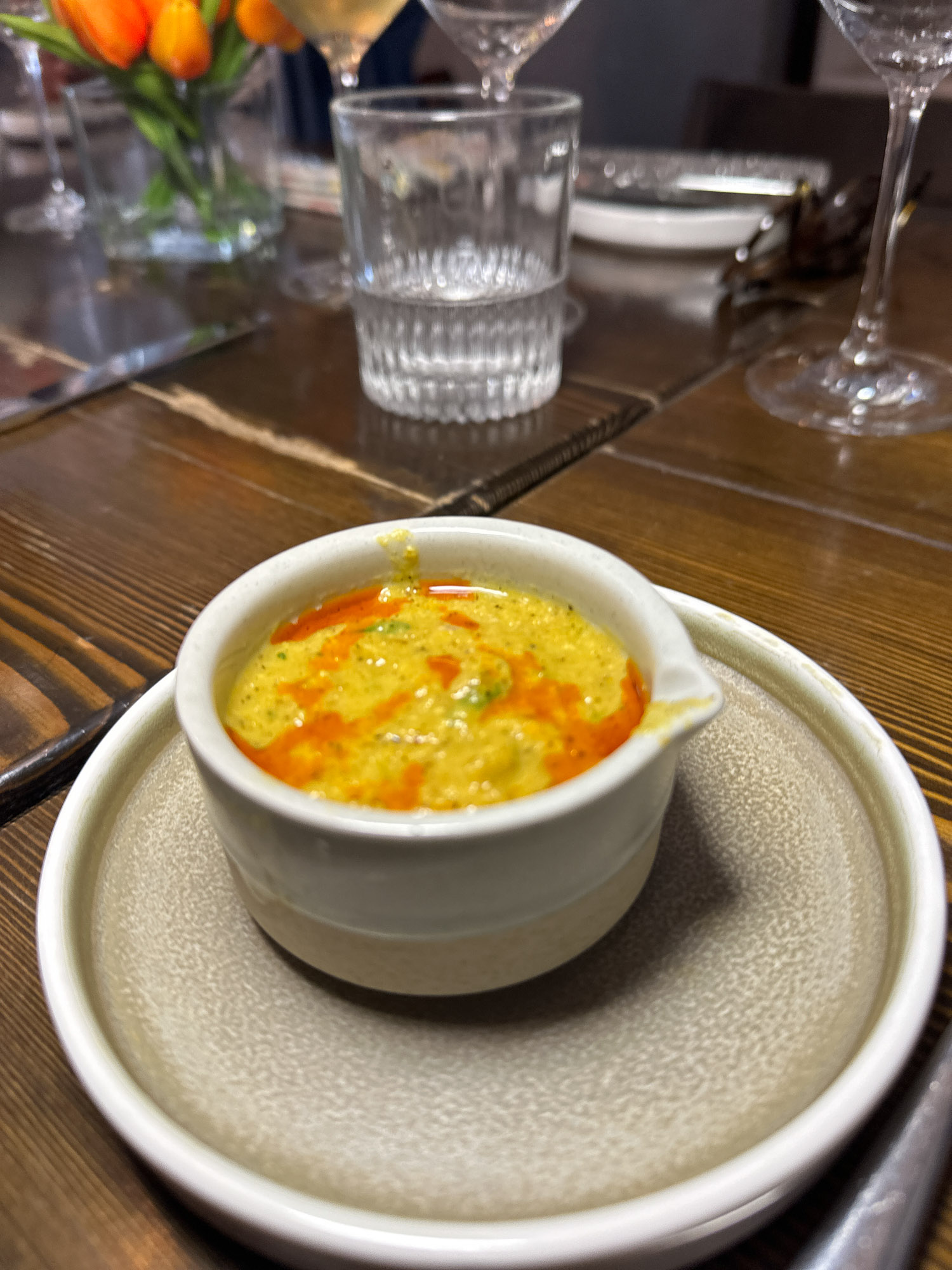 Starting off with the bright flavors of a Caribbean Corned Charred soup, which included a a Somalian spice blend called Hallash. With notes of fenugreek, clove, as undertones, and brightness of sweet roasted corn based on something from Trinidad where there is a lot of migration of people from South Asia.