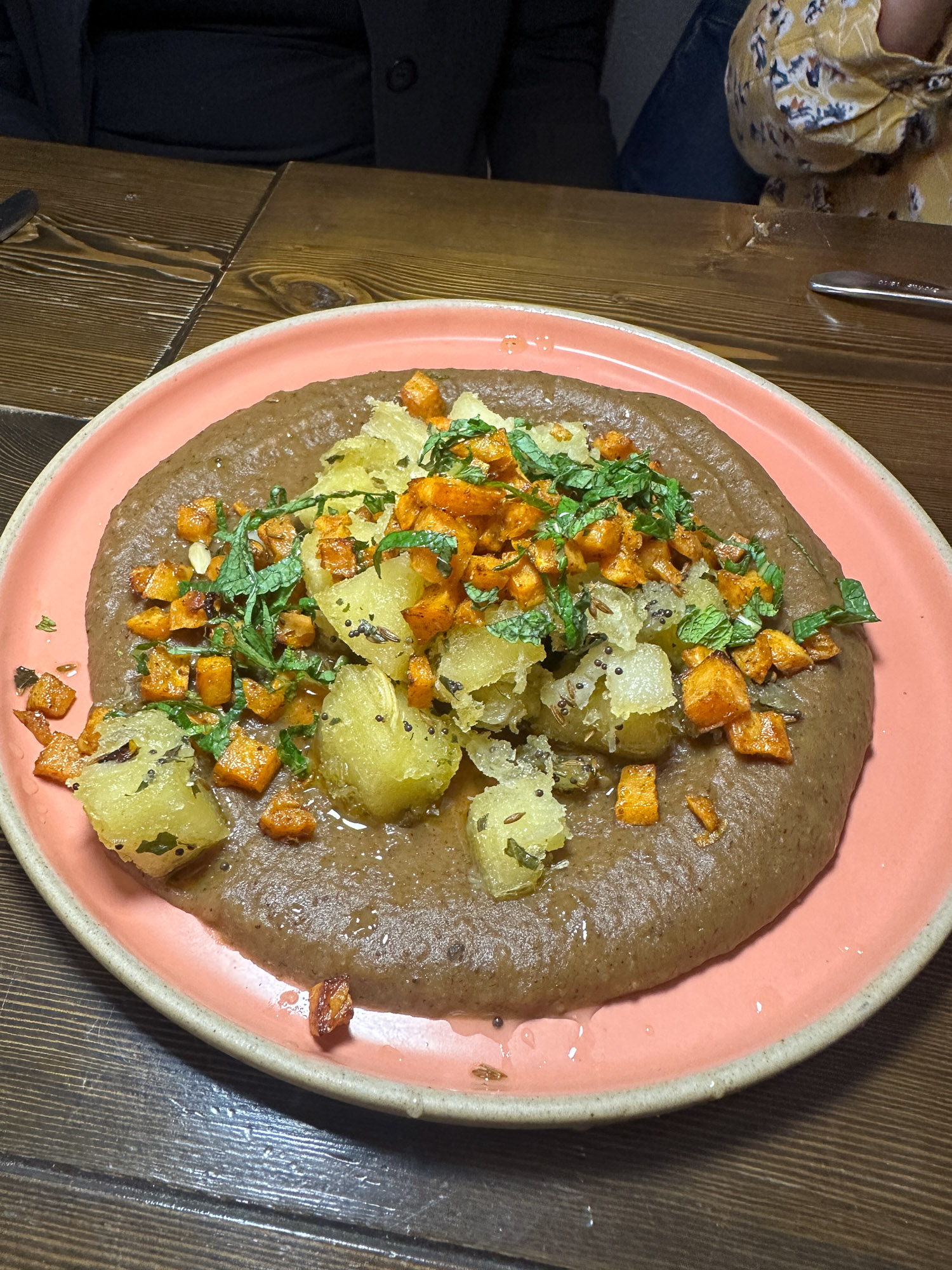 For the main course, we delighted in a dish inspired by East African flavors—a Kenyan specialty known as Koko Kunaka. This aromatic curry, enriched with coconut milk, cardamom, and a hint of lime, offered a refreshing twist to its traditional taste. To elevate its acidity, it was expertly paired with passionfruit chutney. Alongside, we savored chapatis infused with hibiscus, lending them a vibrant purple hue and a delightful flavor boost.