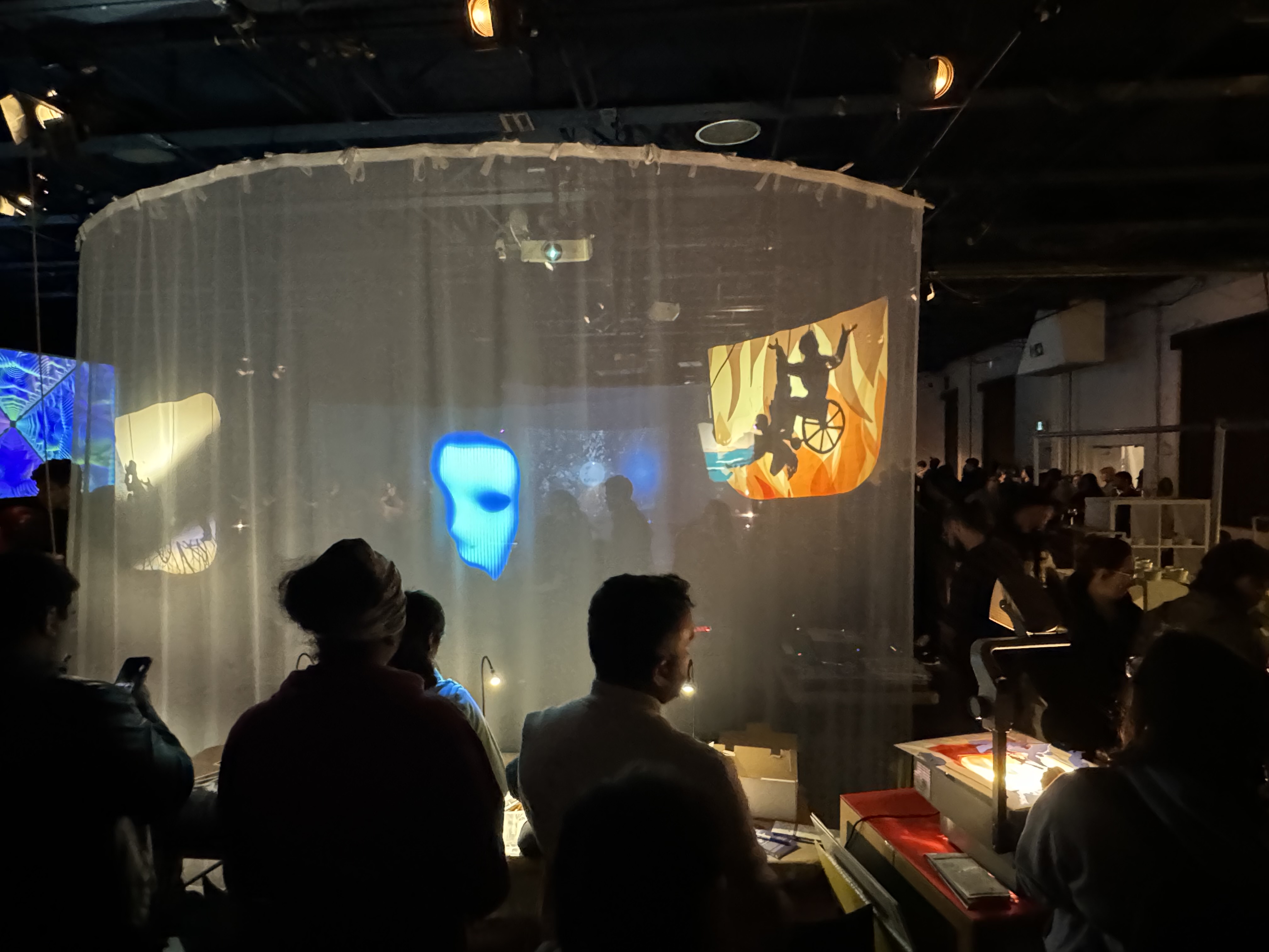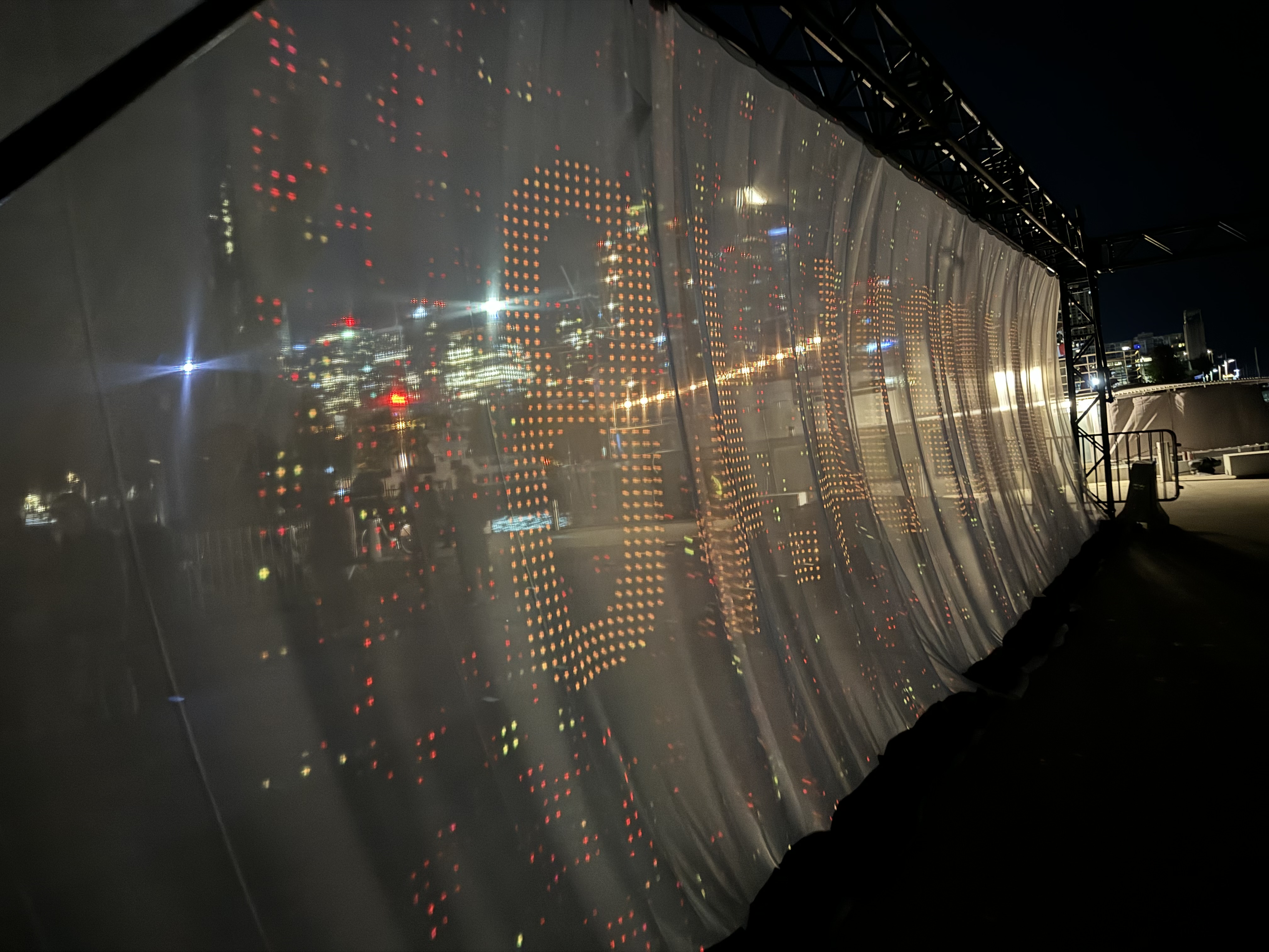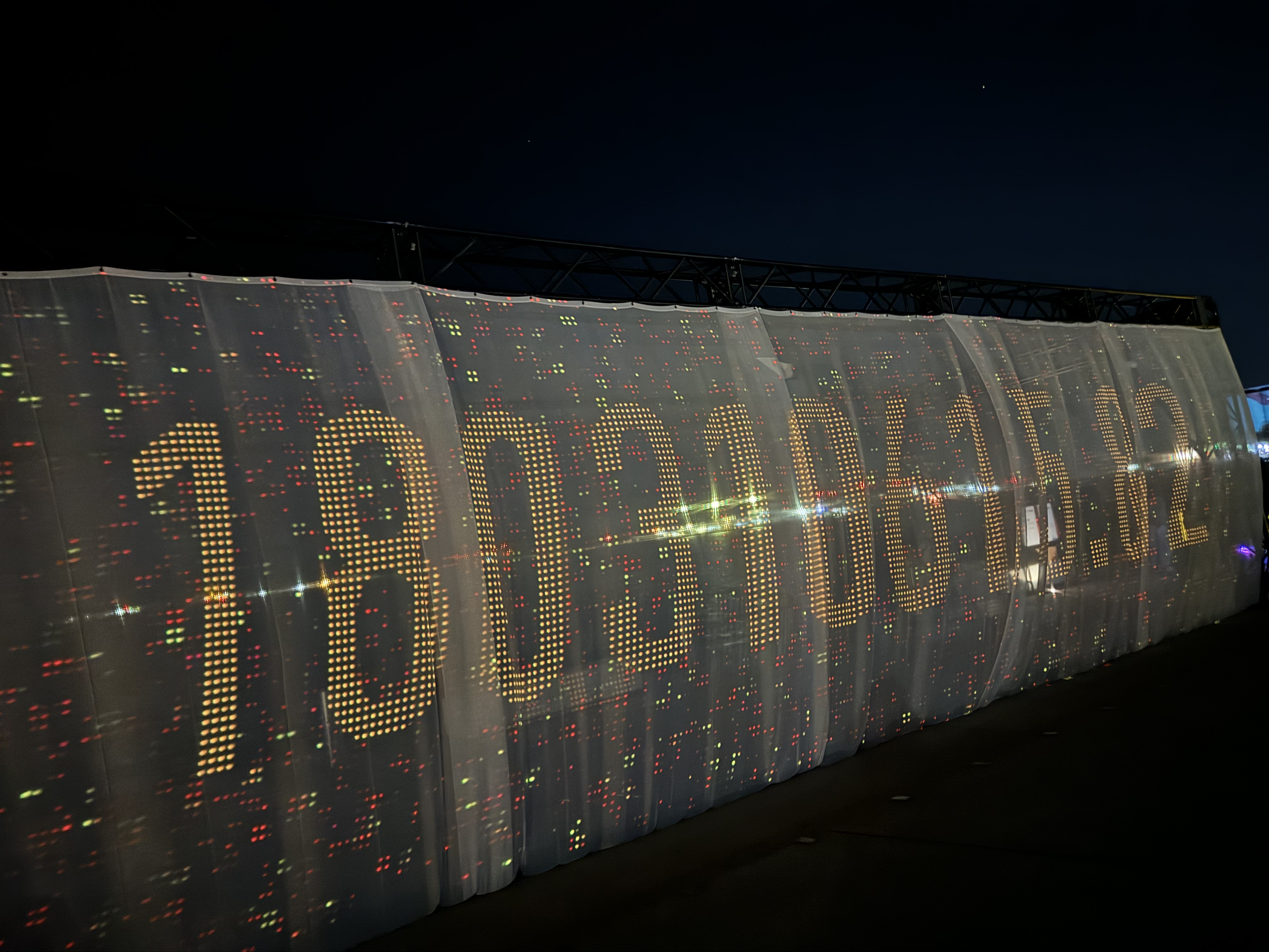 This was all about numbers being showcased on a banner, as it was The Manifest Lab-An illuminated mesh canopy symbolizing our cosmic interconnectedness, invites reflection, empathy and understanding of our shared journey through time and space. Utilizing NASA data, It displays the real-time distance between Toronto and Mars. This Installation serves as a reminder of our collective cosmic journey, Inspiring unity and purpose as we navigate modern challenges.and then we went to MISHANN LAU-WHAT ARE YOU SAYING?