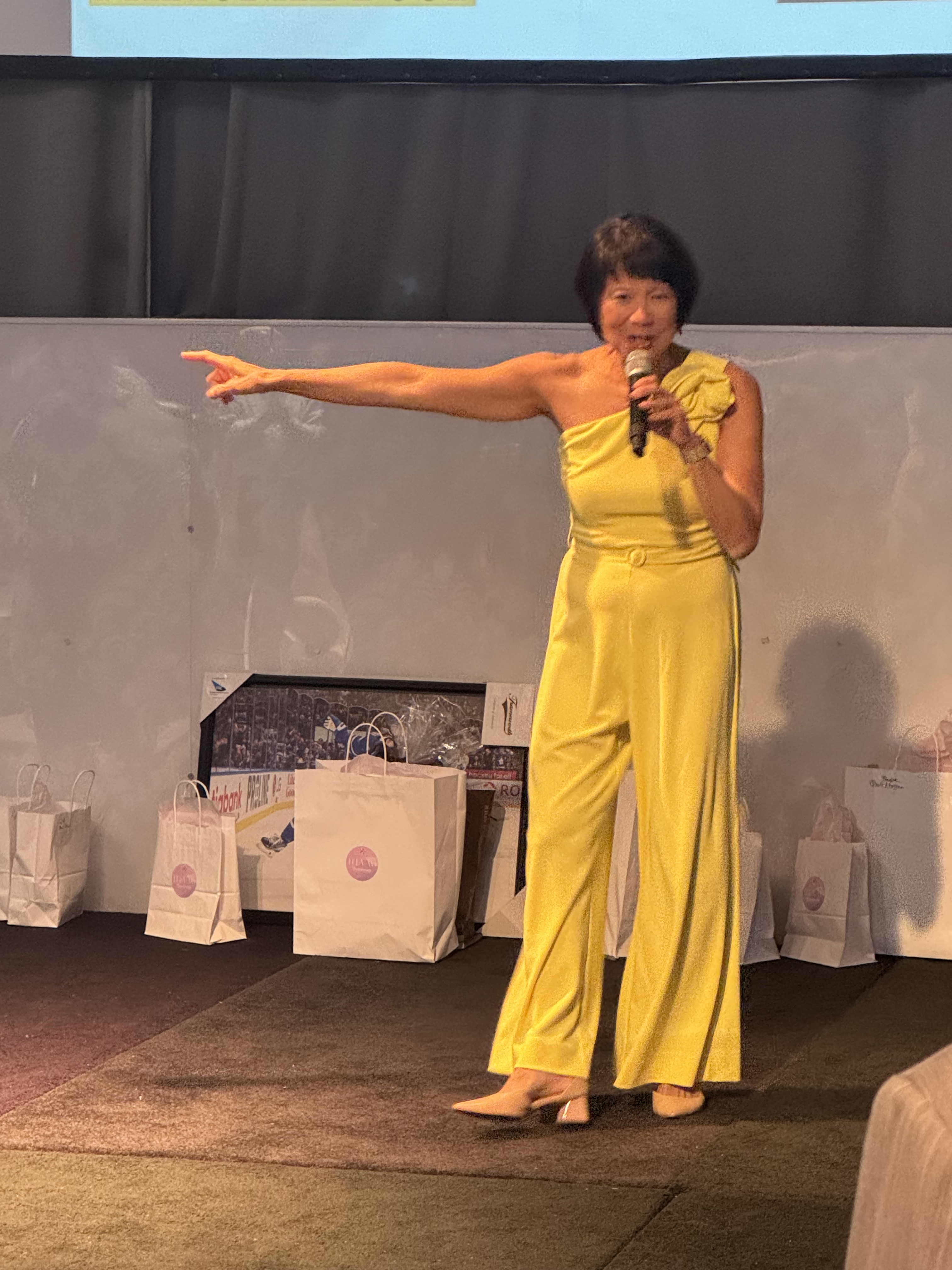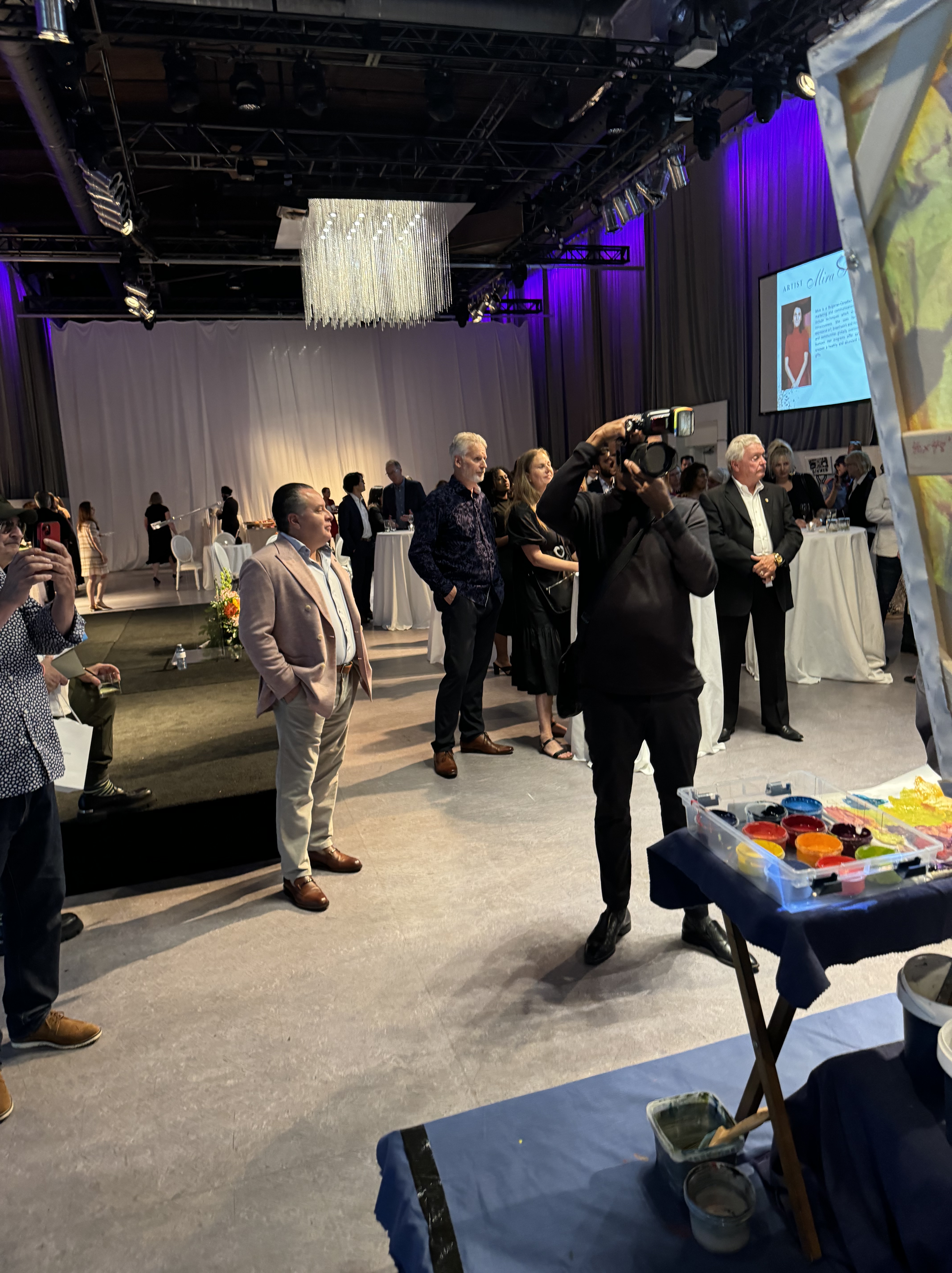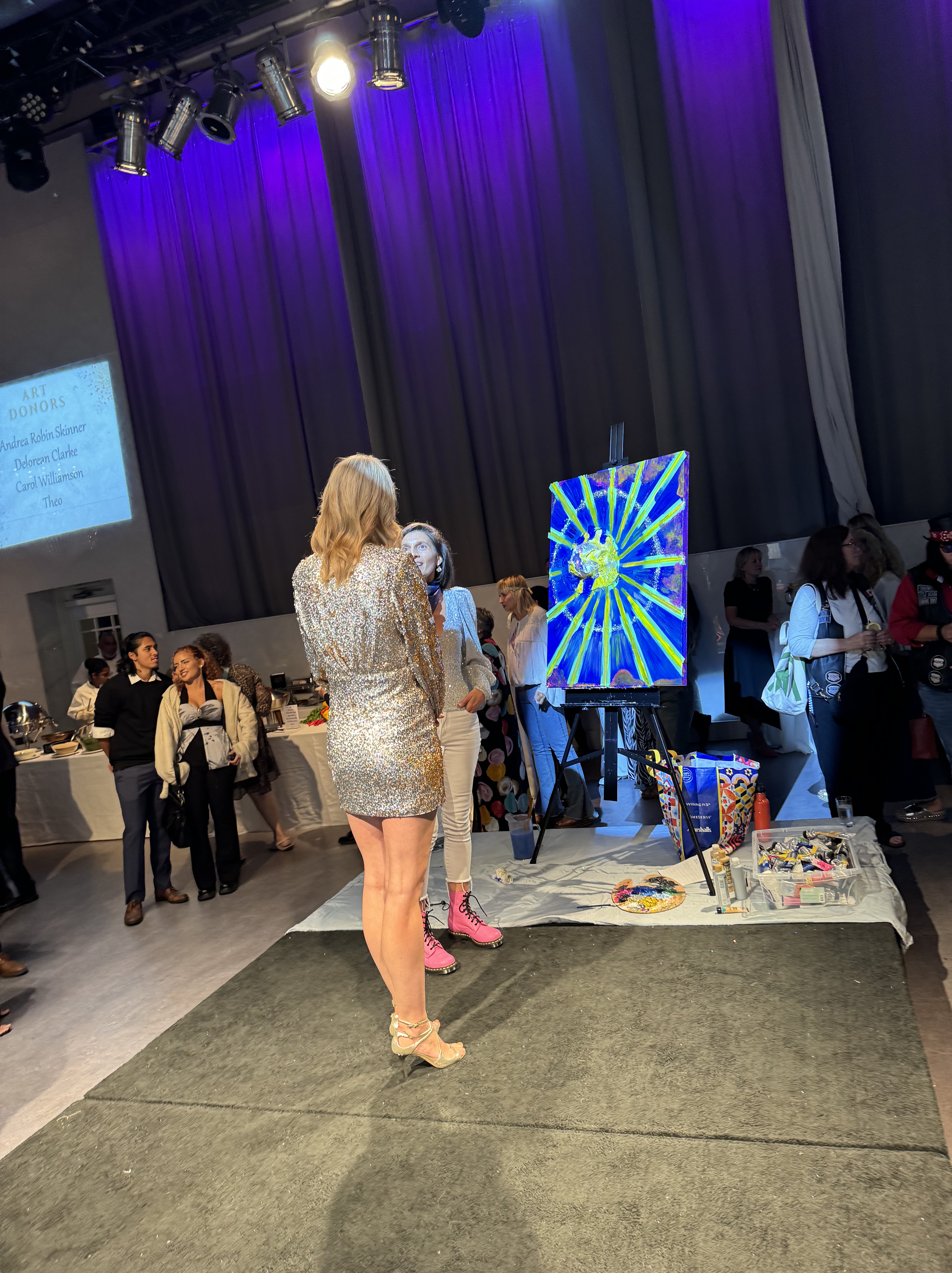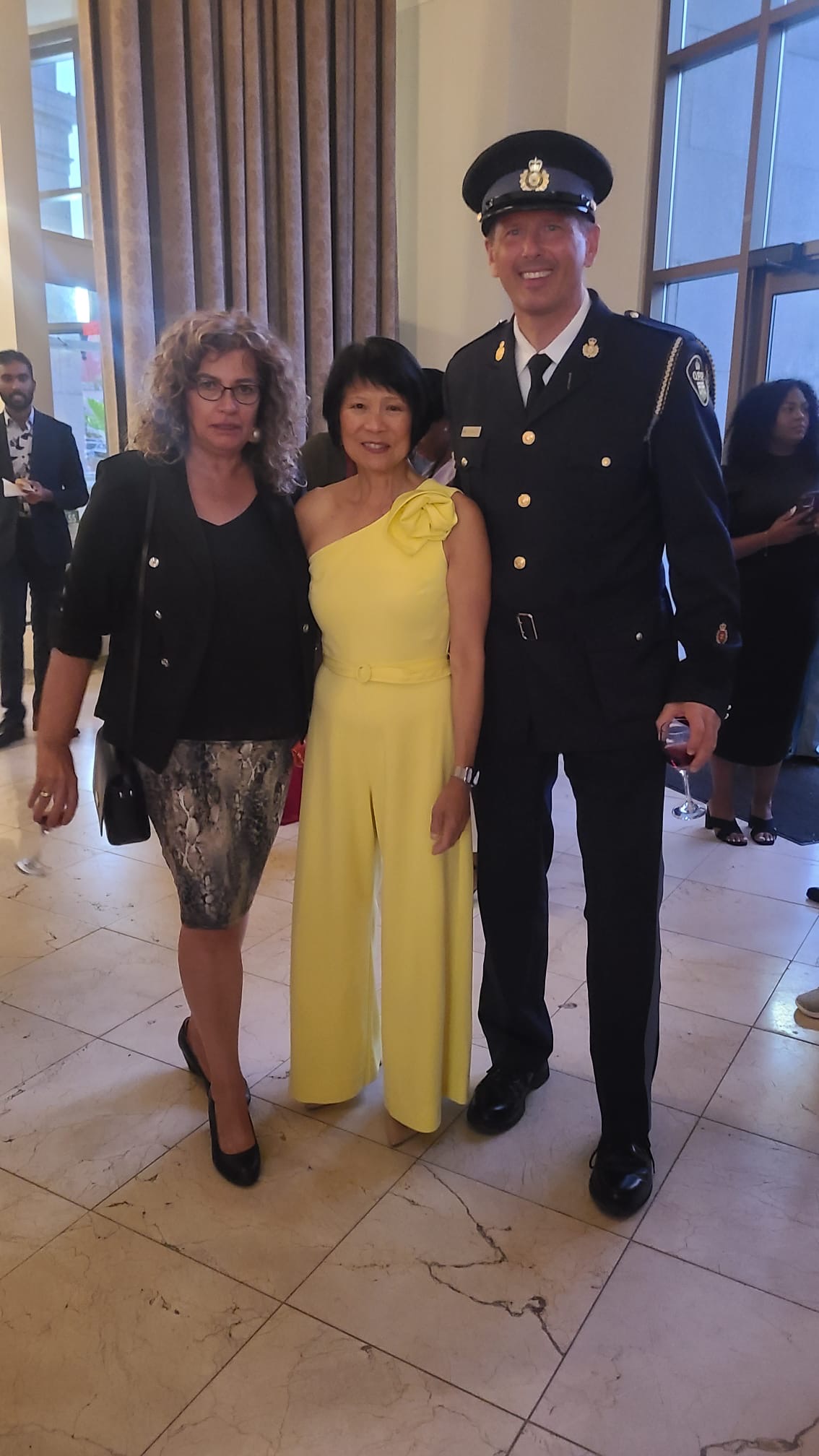 Tables with a wide selection of silent auction items were on display including beautiful artwork. The theme of the evening was the 70s. Some people had fun dressing the part! Two artists, one of them,Tina Newlove, a local artist, were doing live art on huge canvases during the event and then their work was auctioned off. The MC for the evening was the eloquent Michelle Dube, Anchor CTV News Toronto. Toronto Mayor Olivia Chow arrived in a beautiful yellow outfit welcomed everyone and mingled with guests, spending time speaking to those who wished. Lisa Crooker, Superintendent Toronto Police Service who is Co-Chair, Board of Directors, The Gatehouse was the Key Note Speaker. Lisa Crooker spoke candidly and with emotion about her childhood sexual abuse in her own family home. She shared how she had kept this secret for many years, as many abused children and people do, and the need and importance of The Gatehouse.