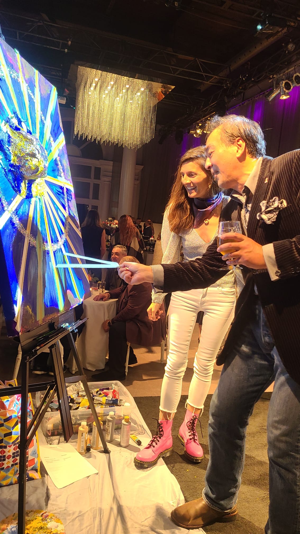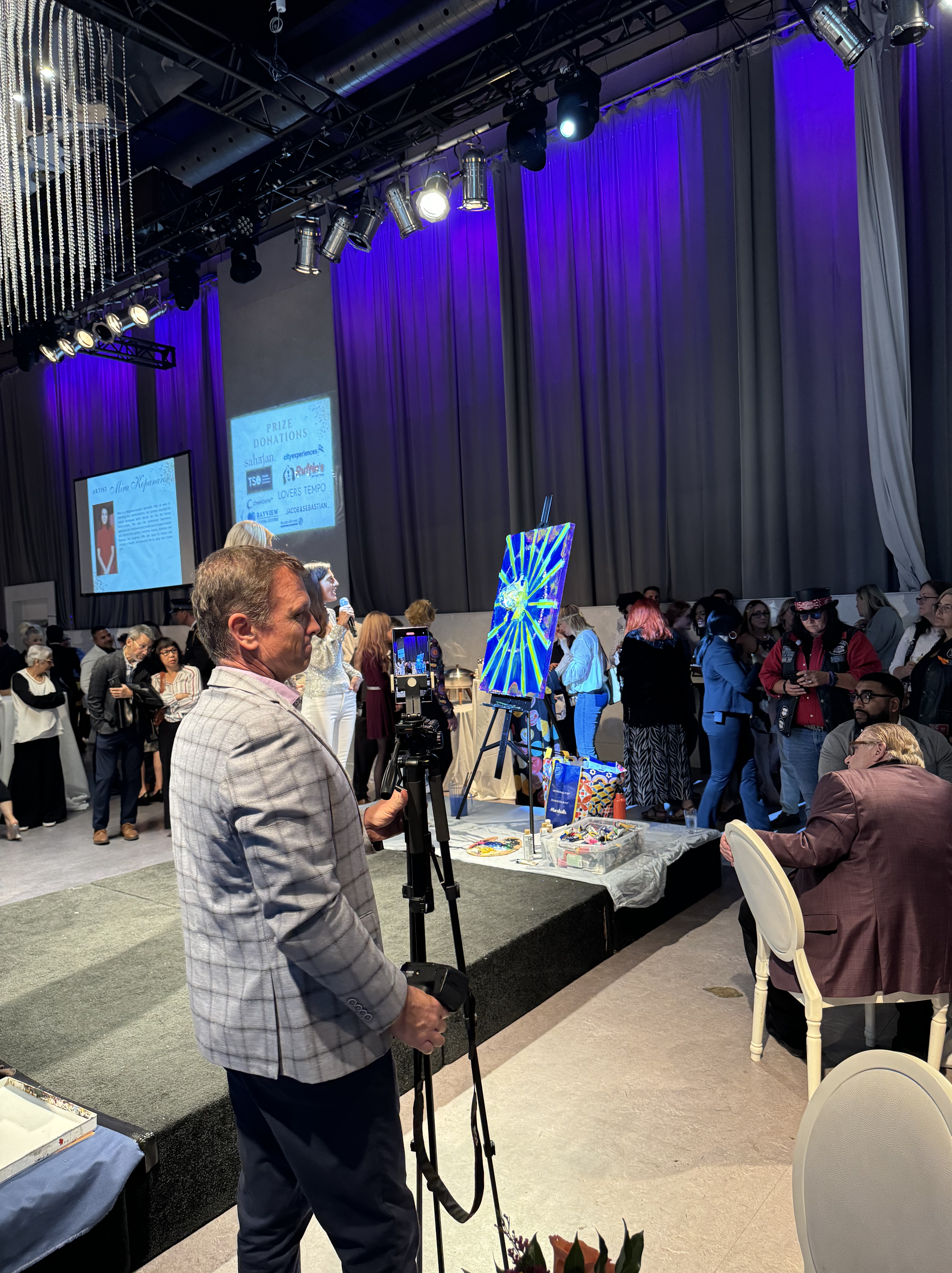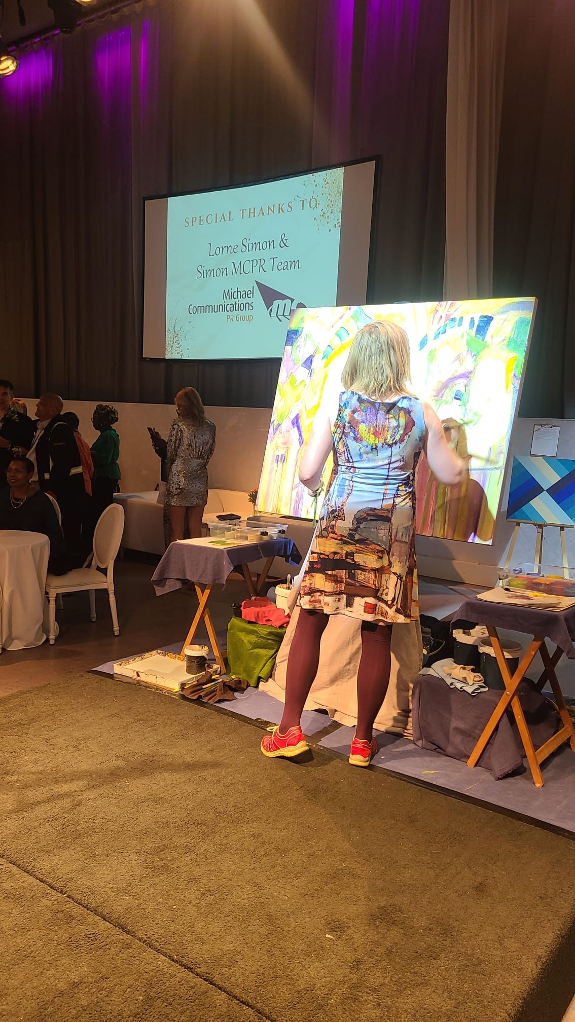 Tables with a wide selection of silent auction items were on display including beautiful artwork. The theme of the evening was the 70s. Some people had fun dressing the part! Two artists, one of them,Tina Newlove, a local artist, were doing live art on huge canvases during the event and then their work was auctioned off. The MC for the evening was the eloquent Michelle Dube, Anchor CTV News Toronto. Toronto Mayor Olivia Chow arrived in a beautiful yellow outfit welcomed everyone and mingled with guests, spending time speaking to those who wished. Lisa Crooker, Superintendent Toronto Police Service who is Co-Chair, Board of Directors, The Gatehouse was the Key Note Speaker. Lisa Crooker spoke candidly and with emotion about her childhood sexual abuse in her own family home. She shared how she had kept this secret for many years, as many abused children and people do, and the need and importance of The Gatehouse.