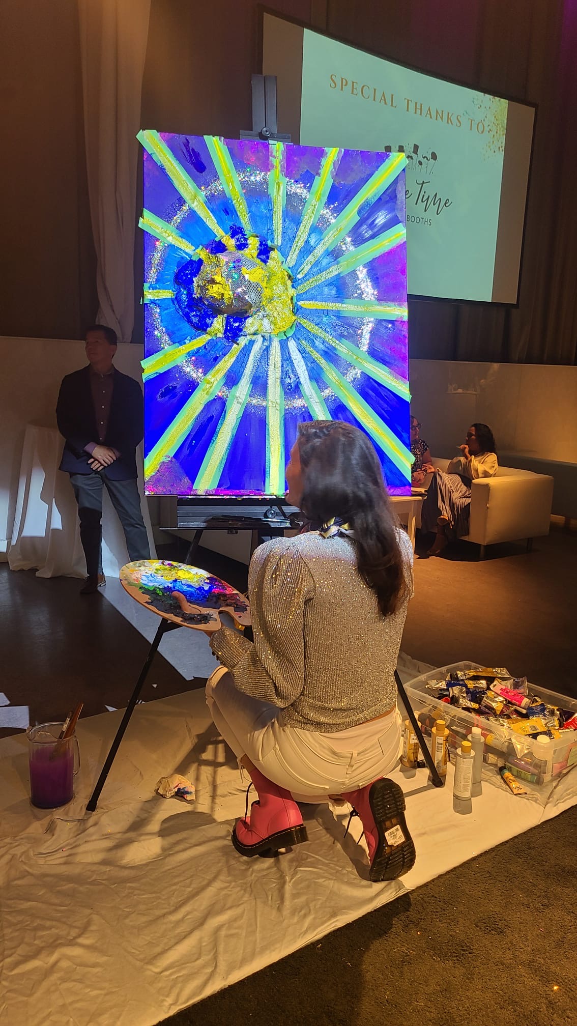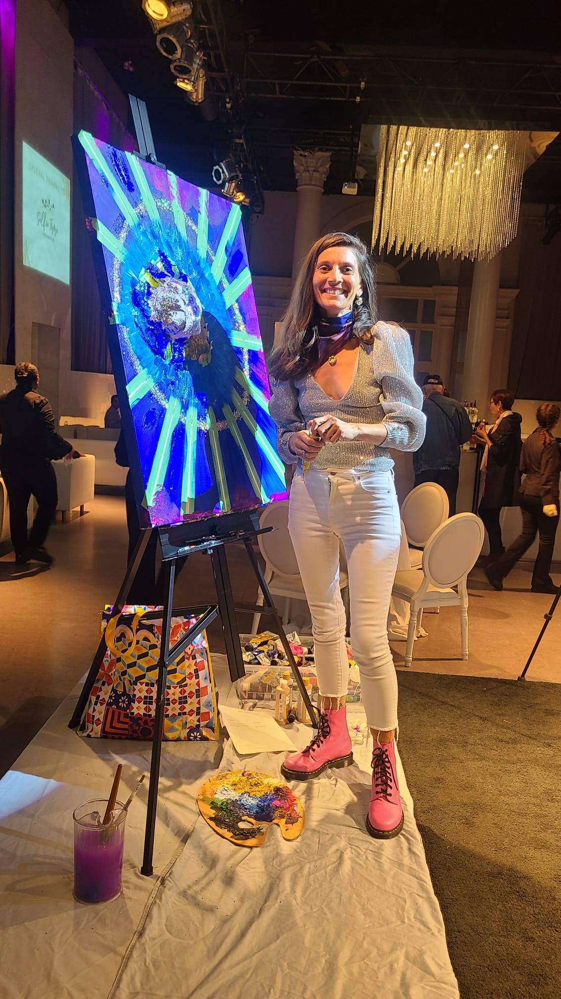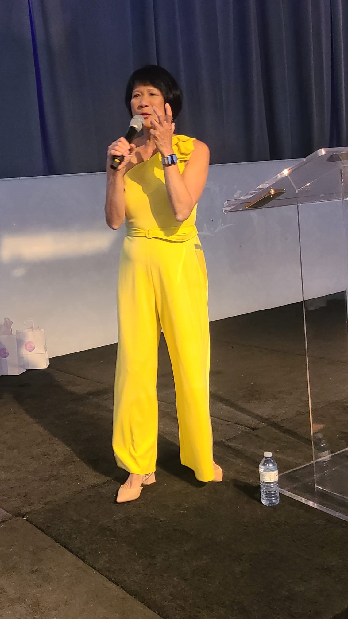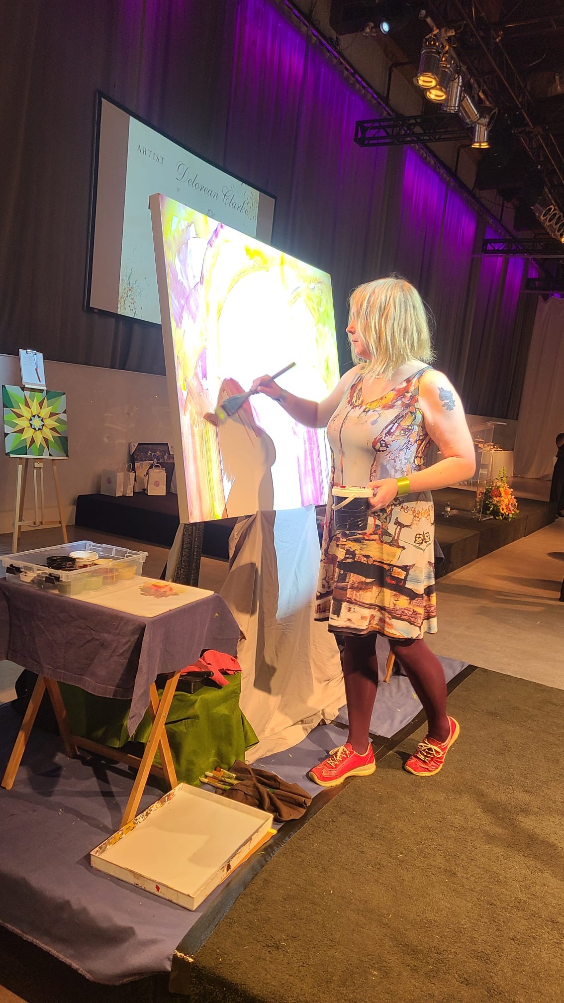 Tables with a wide selection of silent auction items were on display including beautiful artwork. The theme of the evening was the 70s. Some people had fun dressing the part! Two artists, one of them,Tina Newlove, a local artist, were doing live art on huge canvases during the event and then their work was auctioned off. The MC for the evening was the eloquent Michelle Dube, Anchor CTV News Toronto. Toronto Mayor Olivia Chow arrived in a beautiful yellow outfit welcomed everyone and mingled with guests, spending time speaking to those who wished. Lisa Crooker, Superintendent Toronto Police Service who is Co-Chair, Board of Directors, The Gatehouse was the Key Note Speaker. Lisa Crooker spoke candidly and with emotion about her childhood sexual abuse in her own family home. She shared how she had kept this secret for many years, as many abused children and people do, and the need and importance of The Gatehouse.