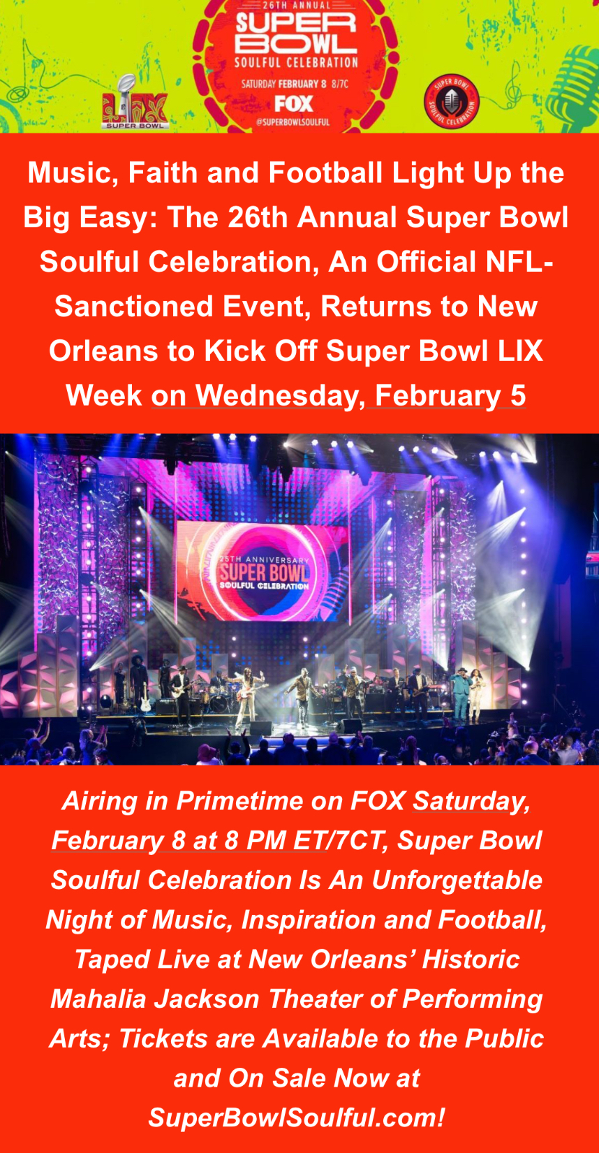 The 26th Annual Super Bowl Soulful Celebration, an official NFL-sanctioned event and a cornerstone of Super Bowl weekend for over a quarter of a century, unites music, faith, and football in the heart of the Big Easy for an unforgettable evening of inspiration on Wednesday, February 5. Held at New Orleans’ historic Mahalia Jackson Theater of Performing Arts, the live television taping honors the rich cultural tapestry of the Crescent City. With unforgettable performances by award-winning artists, the soulful harmonies of the NFL Players Choir, heartfelt tributes to NFL players and leaders, and a celebration of resilience under the theme “Keep Going,” the event will shine a spotlight on the unique elements that make New Orleans the crown jewel of the South. As previously announced, the show premieres on Saturday, February 8, 2025, at 8 PM ET/7 PM CTas a primetime special on FOX, the official broadcast home of Super Bowl LIX. In addition, after the initial airing, the special will be available on demand via the FOX Sports App, FOXSports.com, HULU, Tubi and FOX Soul. The annual Super Bowl Soulful Celebration is the NFL’s only sanctioned inspirational concert, uniting cultures through the power of music, faith, and football. Featuring performances from diverse genres such as R&B, Gospel, and Country, past artists include Kirk Franklin, Patti LaBelle, Earth, Wind & Fire, Yolanda Adams, T-Pain, Mary Mary, Snoop Dogg, Mickey Guyton, Gladys Knight, Robin Thicke, and more. A highlight of the show each year is the NFL Players Choir, featuring current and former players delivering a moving musical performance that celebrates the power of faith and unity. Super Bowl Soulful Celebration also honors NFL players both on and off the gridiron, spotlighting their contributions to making the world a better place. WHEN: LIVE TELEVISION TAPING: Wednesday, February 5, 2025 Red Carpet Arrivals: 5 PM – 7 PMDoors open: 6:30 PM Show begins: 7:30 PM AIRDATE:Premieres on Saturday, February 8 at 8 PM ET/7CT on FOX. VOD: FOX Sports App, FOXSports.com, HULU, Tubi and FOX Soul WHERE: Mahalia Jackson Theater of the Performing Arts1419 Basin St, New Orleans, LA 70116(504) 525-1052 TICKETS: Tickets are available to the public and on sale now! Don’t miss this unforgettable night of inspiration, music, and celebration. Visit https://www.mahaliajacksontheater.com. tosha@frontpagefirm.comFOLLOW THE CELEBRATION: Follow us @superbowlsoulful or visit superbowlsoulful.com for show updates and exclusive content. PARTNERSHIP/SPONSORSHIP OPPORTUNITIES: For partnership opportunities for this monumental event, please contact: Melanie Few, Info@superbowlsoulful.com Super Bowl Soulful Celebration, formerly Super Bowl Gospel Celebration (SBGC), is founded and executive produced by Atlanta-based marketing consultant Melanie Few. Conceived in 1999 as a gospel brunch in Miami, Super Bowl Soulful Celebration continues as the only multicultural program and inspirational event sanctioned by the NFL during Super Bowl weekend. The evening brings together an ensemble of NFL players, gospel/contemporary Christian performers, comedy, and award-winning musicians spanning all genres on one stage for a spectacular show filled with song, hope, laughter, and uplifting messages of inspiration. THE 26th ANNUAL SUPER BOWL SOULFUL CELEBRATION is executive produced by Melanie Few, with Valarie Benning Thompson serving as producer. Veteran television creative Leon Knoles serves as Director, with Grammy-nominated artist Adam Blackstone serving as music director. For more information, visit superbowlsoulful.com and follow updates @superbowlsoulful to stay connected.