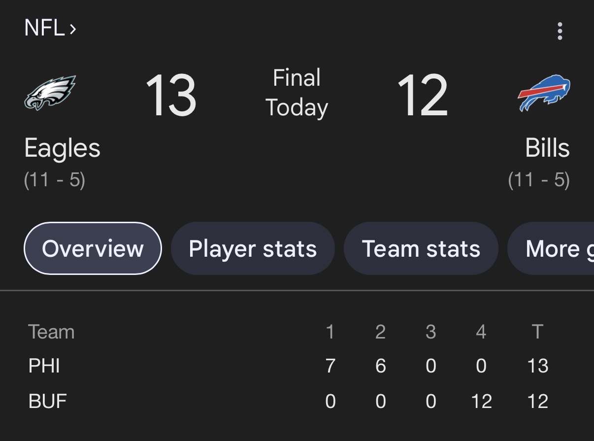 It was a low scoring game, with the Buffalo Bills never getting their game together for a 13-12 loss to the Philadelphia Eagles in the rain Sunday night at Highmark Stadium, and the New England Patriots’ easily beating the lowly New York Jets and this ending the divisional race with one week left in the regular season.